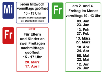 Der Bücherwagen vor der Tür der Stadtteilbibliothek wird sehr gut angenommen, so gut, dass der vorhandene Nachschub ziemlich abgeräumt ist. Wer also Zuhause Platz im Bücherregal braucht oder sich ansonsten von seinen aktuellen, sauberen Romanen und Erzählungen trennen möchte, kann sie gerne bei der Stadtteilbibliothek abgeben. Nachgefragt sind auch Kinderbücher, aber keine Fachbücher, Lexika und Klassiker. Die Euro-Spenden, die von den Abnehmern in die bereit stehende Spardose geworfen werden, werden für Neuanschaffungen der Bibliothek eingesetzt.